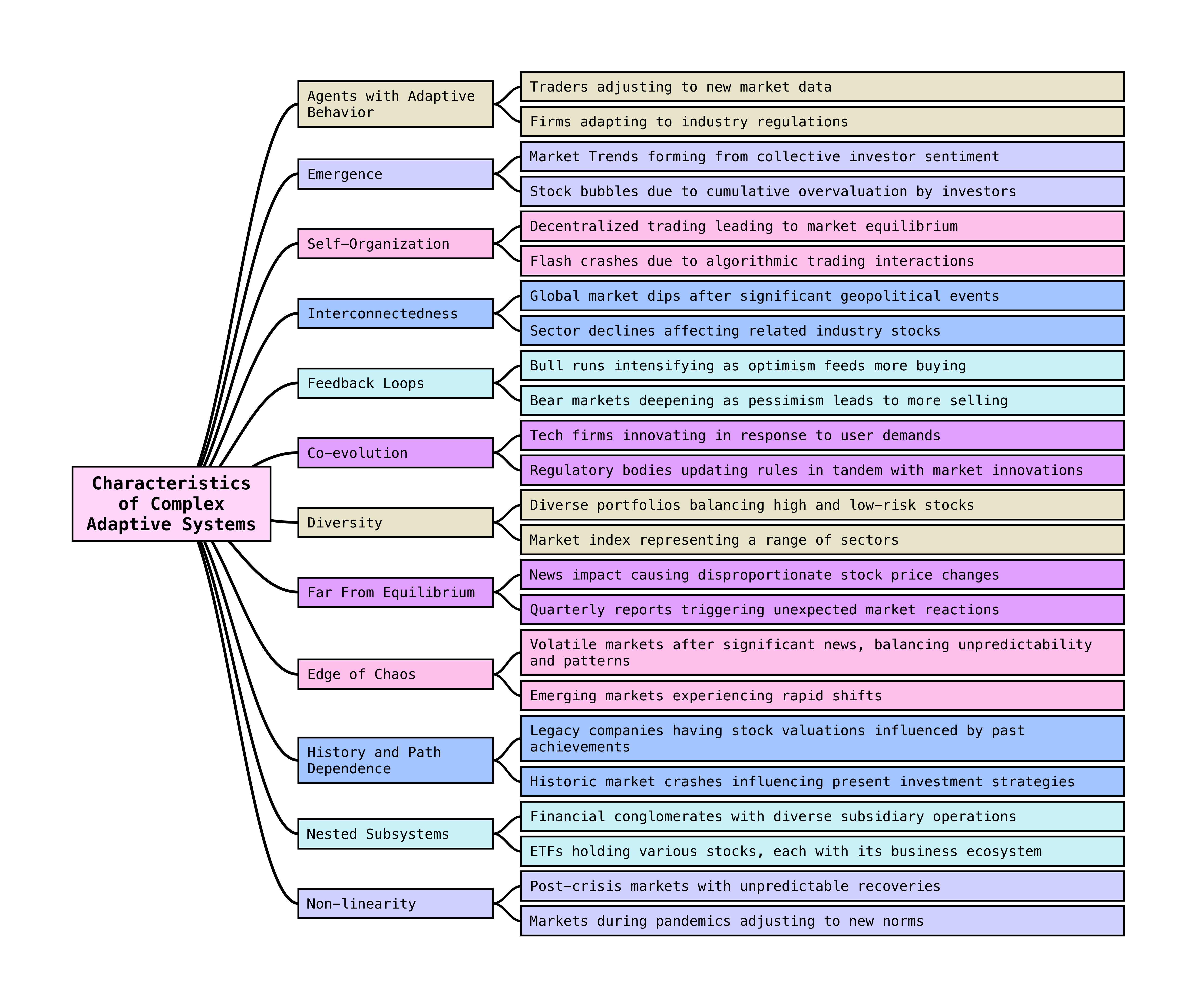 The stock market is an example of a complex adaptive system. It consists of multiple agents (investors, traders, institutions) that interact based on individual strategies, goals, and information. Their collective decisions result in the emergent behavior of the market — stock prices going up or down, market booms, and busts.